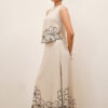 A two piece skirt set in a linen blend. Comes with a floral embroidered top that features a V-neck with a front placket and an easy fit, while the skirt has a back elastic for added comfort and ease.